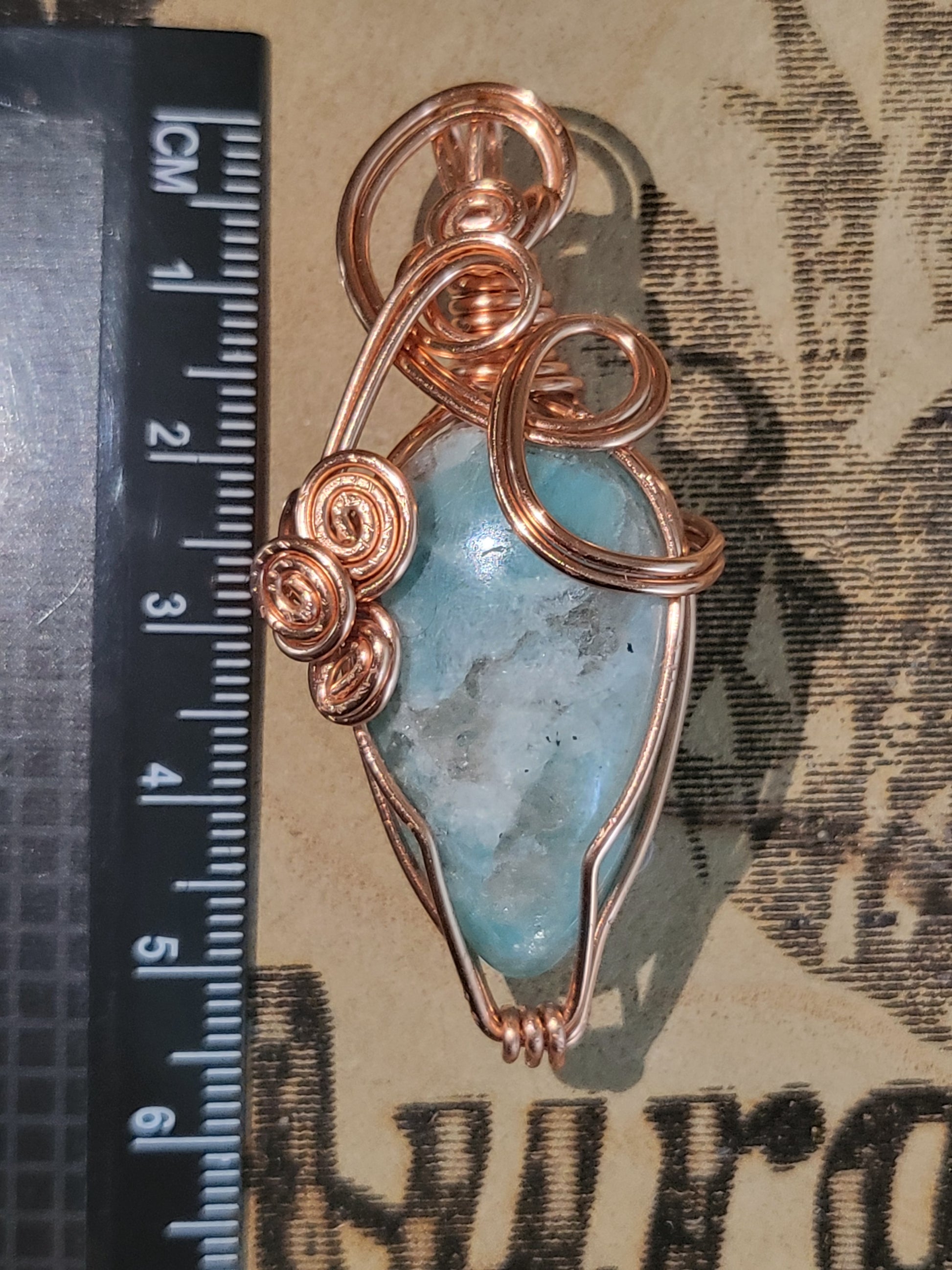 Beautiful amazonite with smokey quartz inclusions, wrapped in copper wire, comes on an adjustable black cord necklace