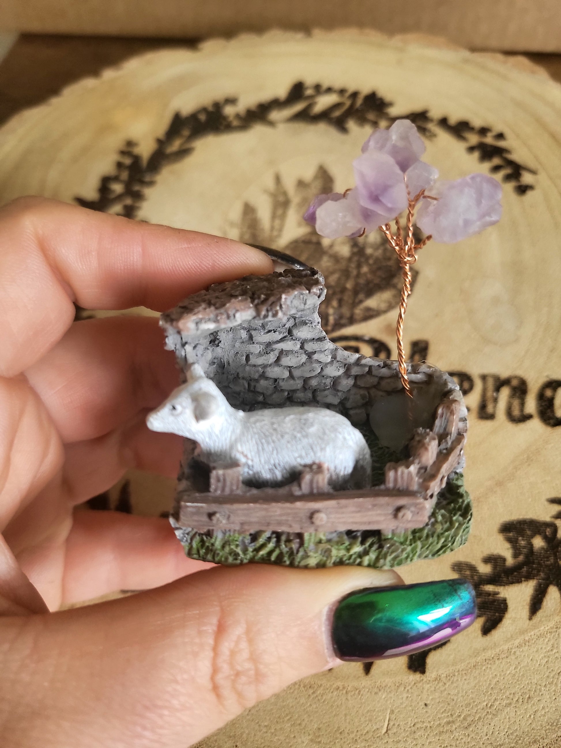 Cute little lamb figure with amethyst flower chip tree.