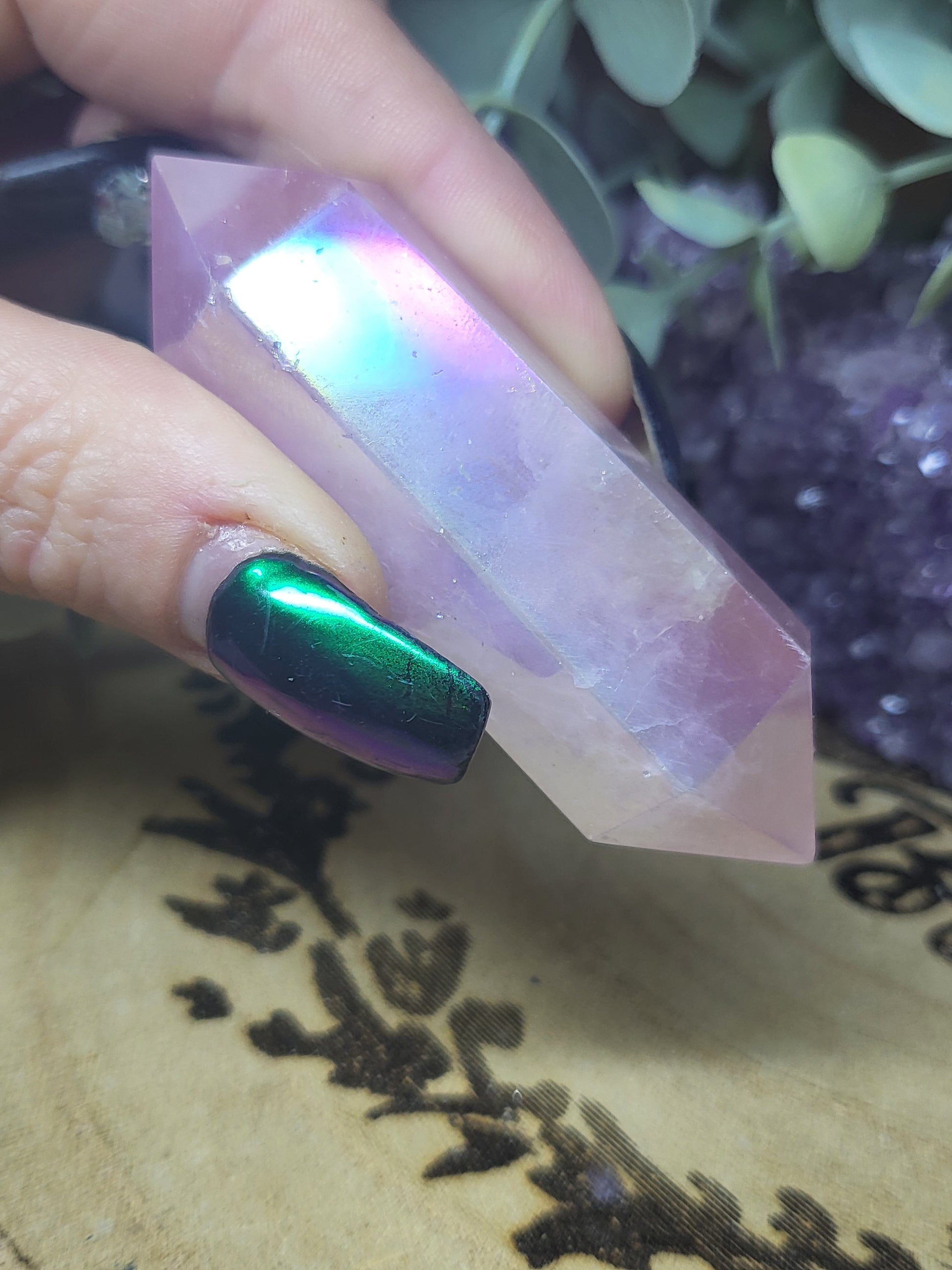 Introducing the Aura Rose Quartz double point, a unique and beautiful natural rose quartz, coated with a stunning aura sheen. Add a touch of elegance and positivity to your home decor or crystal collection. Perfect for promoting love, harmony, and emotional healing.