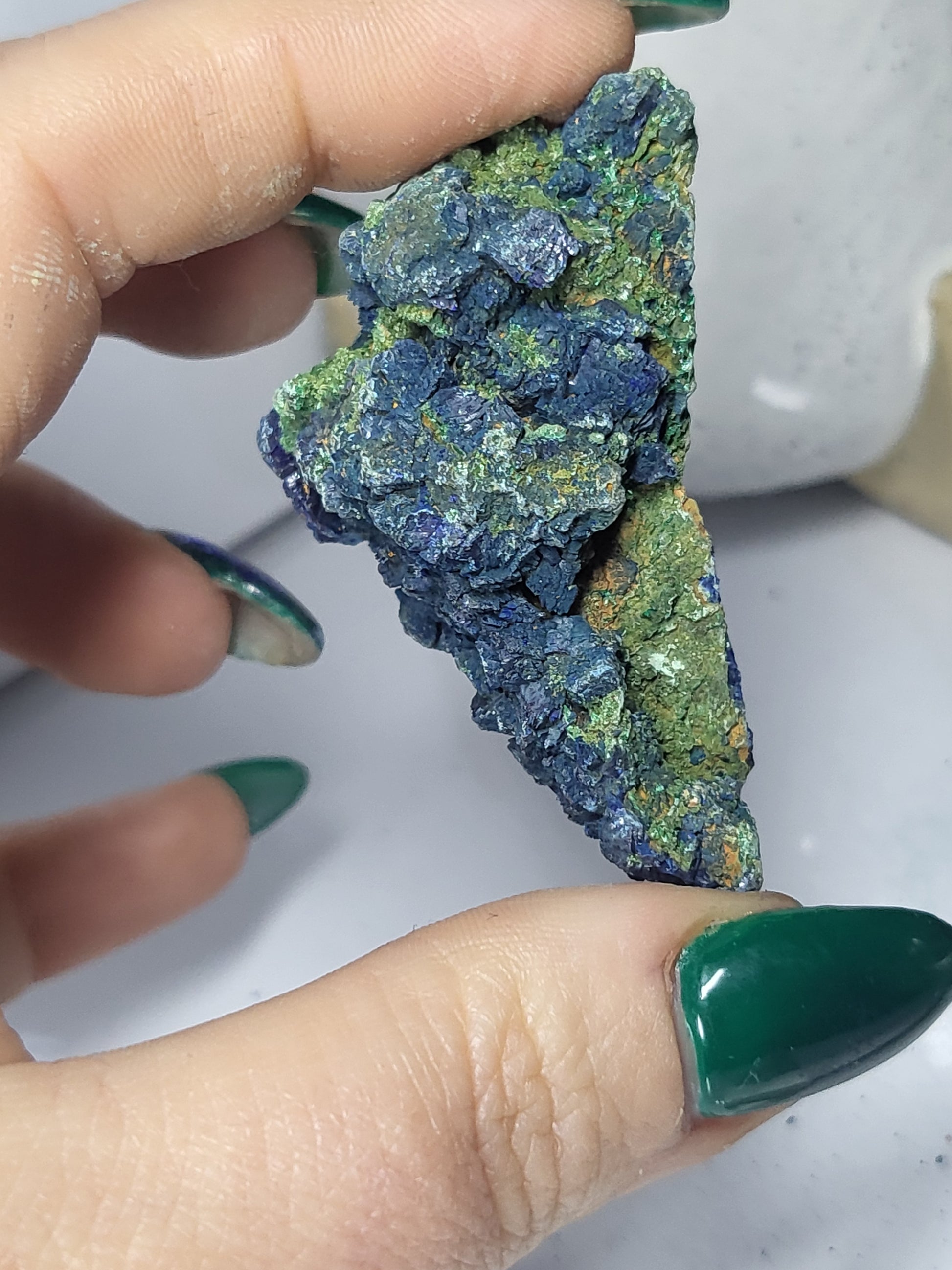 This stunning combination of azurite and malachite is a must-have for any mineral or gemstone enthusiast. The rich blue and vibrant green colors are a natural wonder, perfectly complementing each other in a stunning display. With this unique piece, you can add a touch of beauty and sophistication to any collection.
