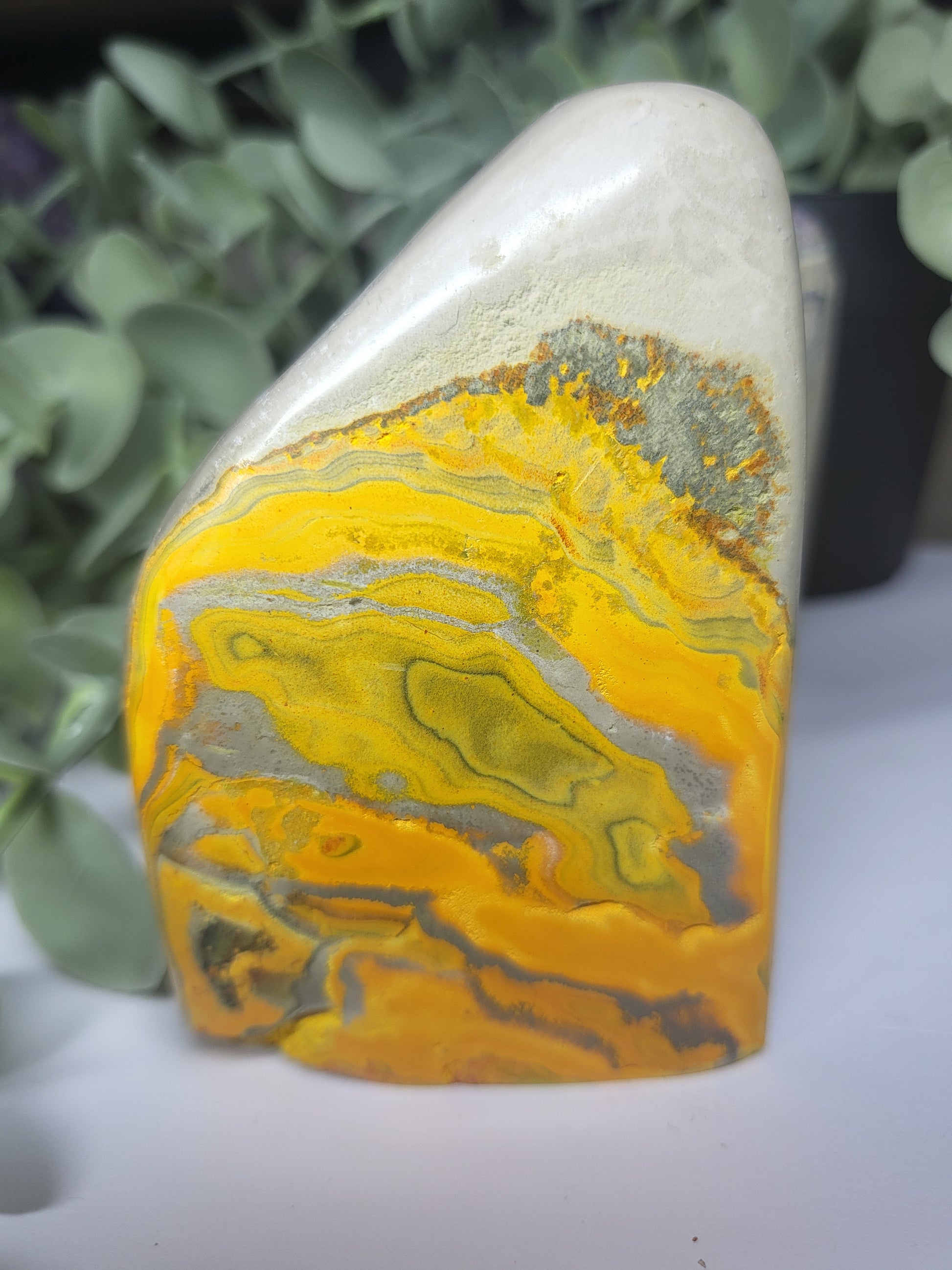 Experience the electrifying beauty of our Bumblebee Jasper Free Form! This unique stone features bright yellows and stunning patterns, making it a one-of-a-kind addition to any collection. Feel the energy of this powerful crystal as it brings joy and positivity into your life. Own a piece of nature's artwork today!