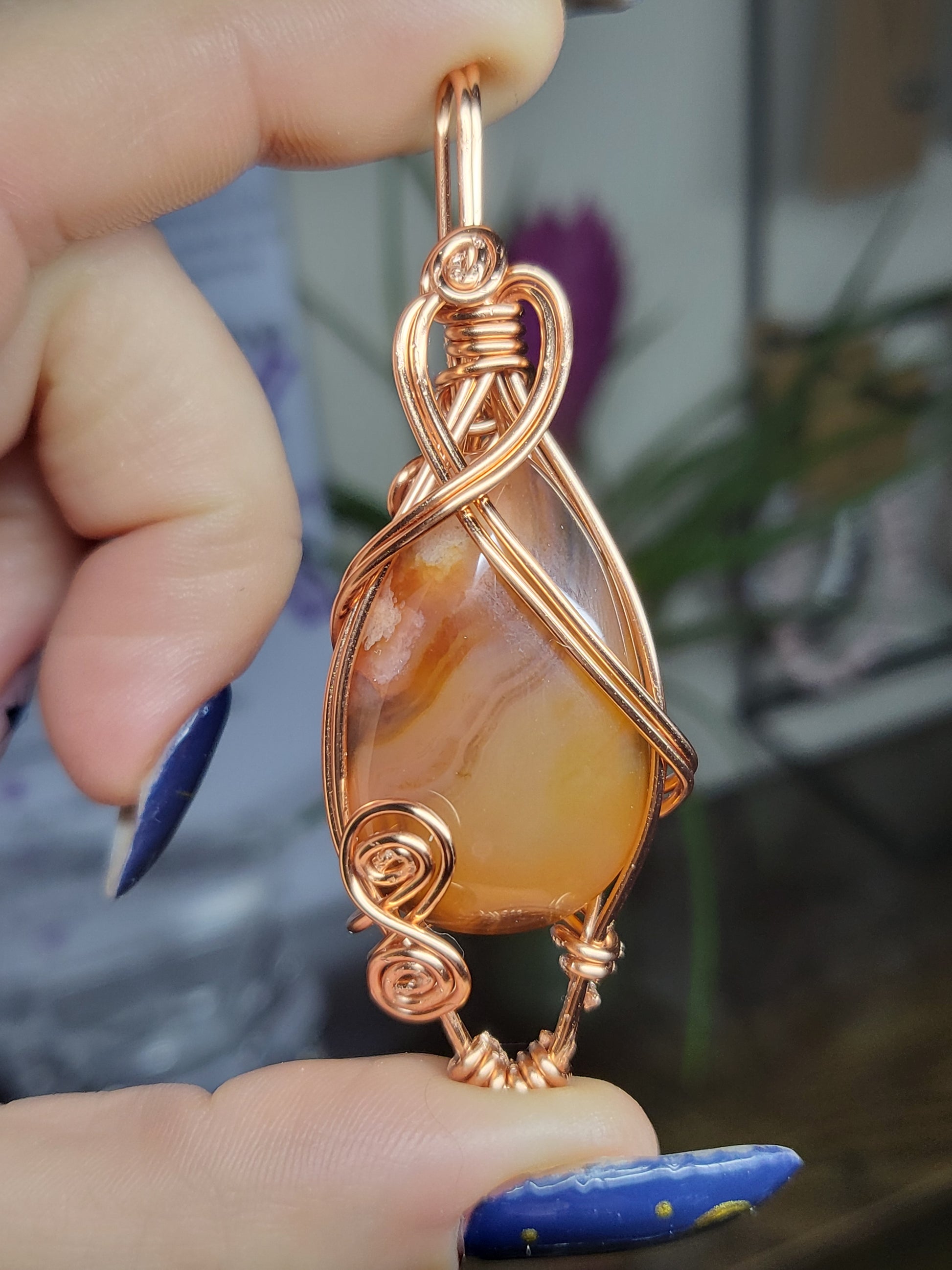 Amplify your energy with our Carnelian copper wrapped pendant! This stunning piece features a Carnelian crystal, known for its revitalizing properties, wrapped in copper wire to further enhance its effects. Comes on a stylish black cord necklace. Elevate your energy and style with this unique pendant!