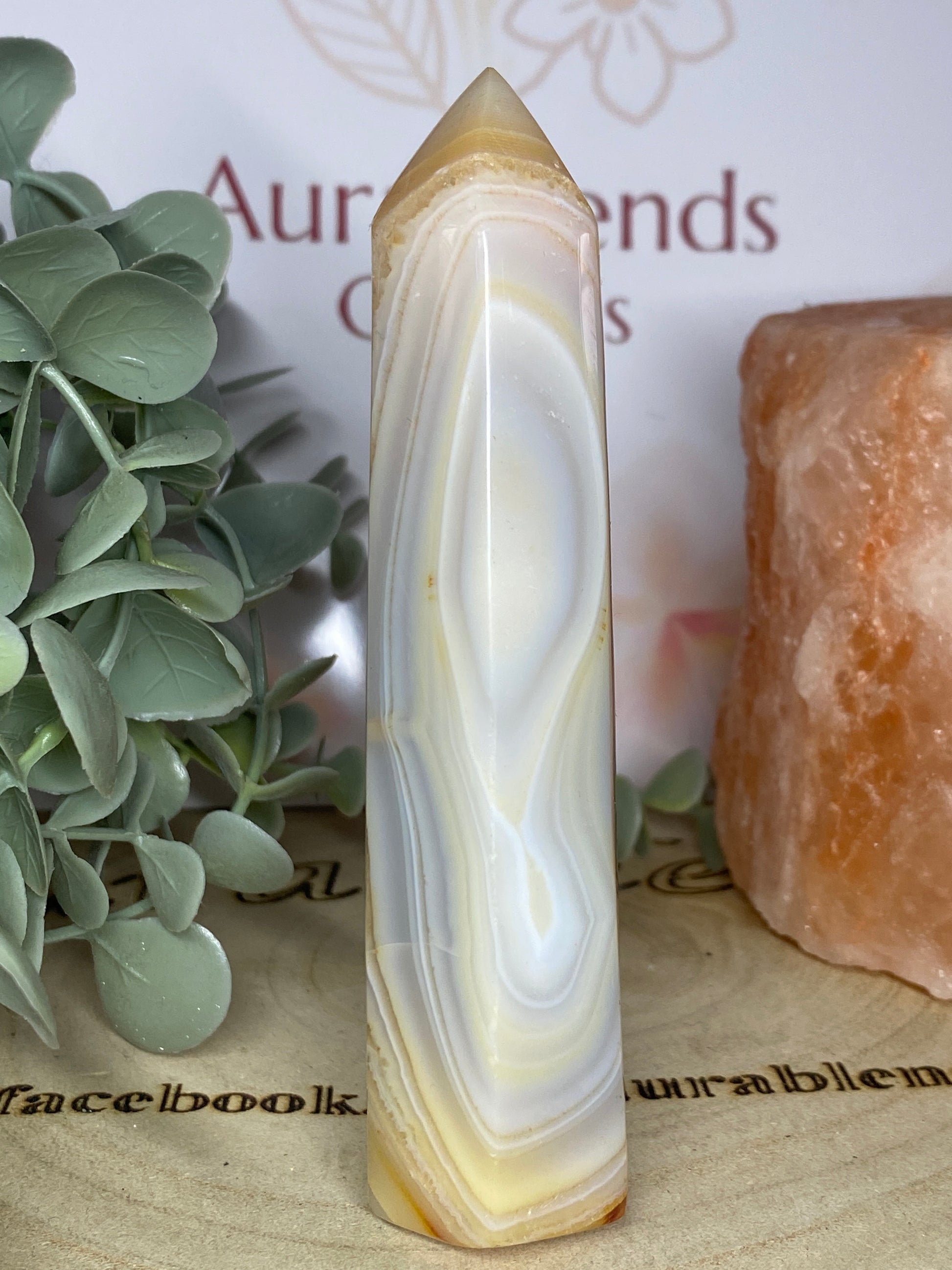 Stunning carnelian tower with beautiful banding and quartz running through it.