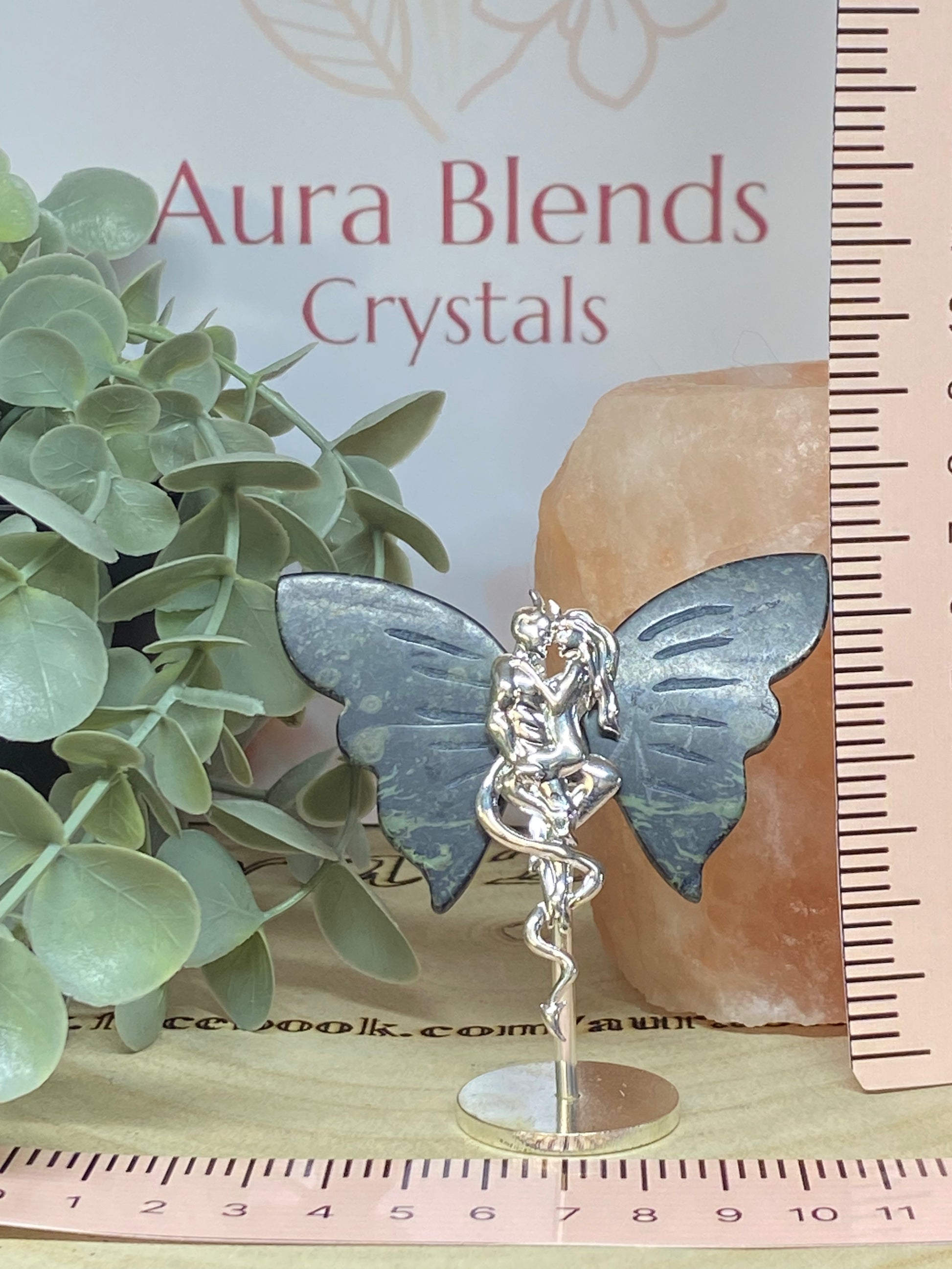 This Kambaba Jasper Devil and Woman Wings is a beautifully designed piece, featuring a devil and woman with crystal wings carved from Kambaba Jasper. The unique design provides a stunning and eye-catching look that is sure to make a statement. Add a touch of elegance and intrigue to your collection.