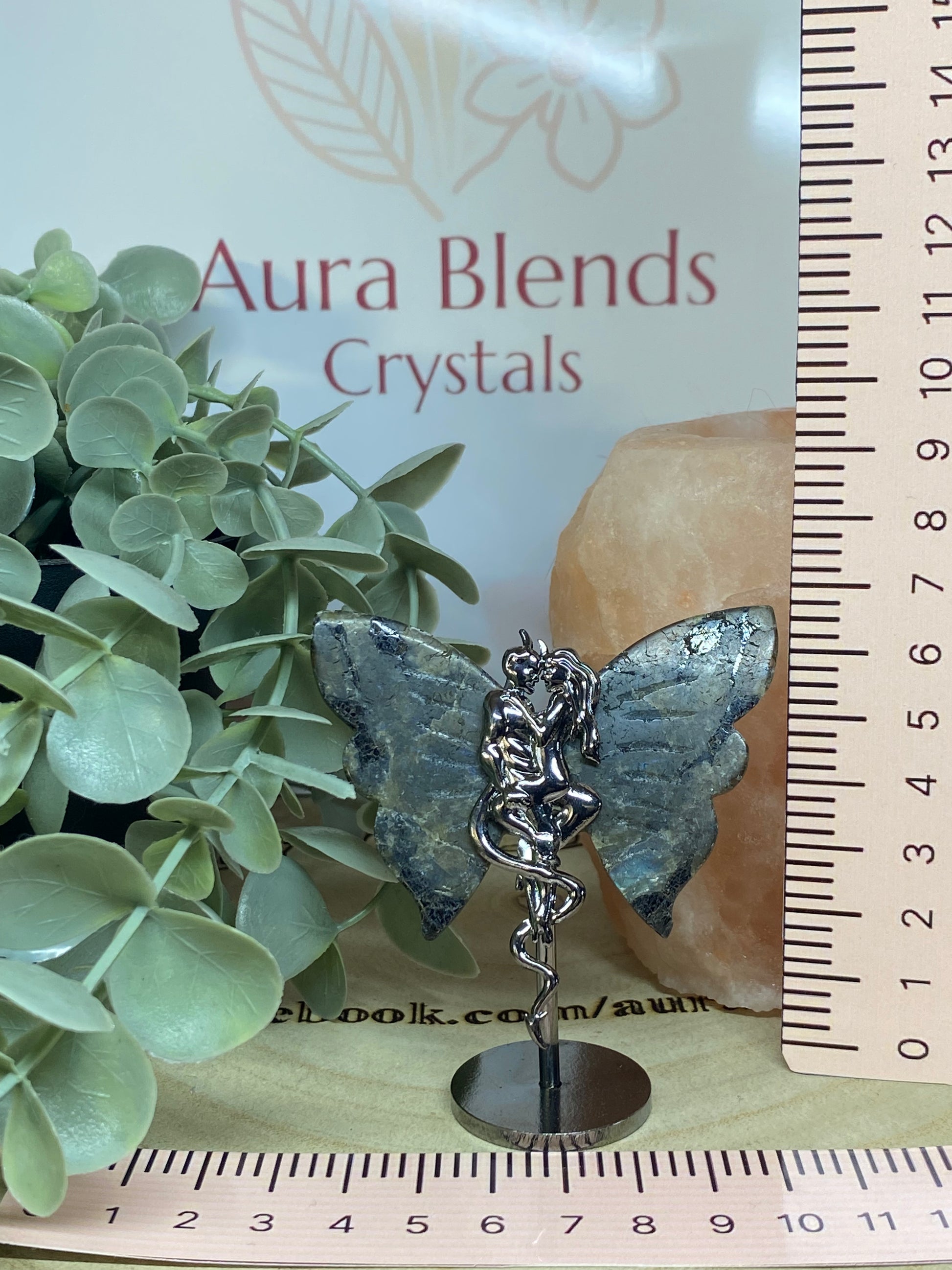 Expertly crafted and carved from labradorite, this stunning piece features a devil and woman with elegant crystal wings that shimmer with blue flashes. A unique and eye-catching design that will add a touch of mystique to any collection.