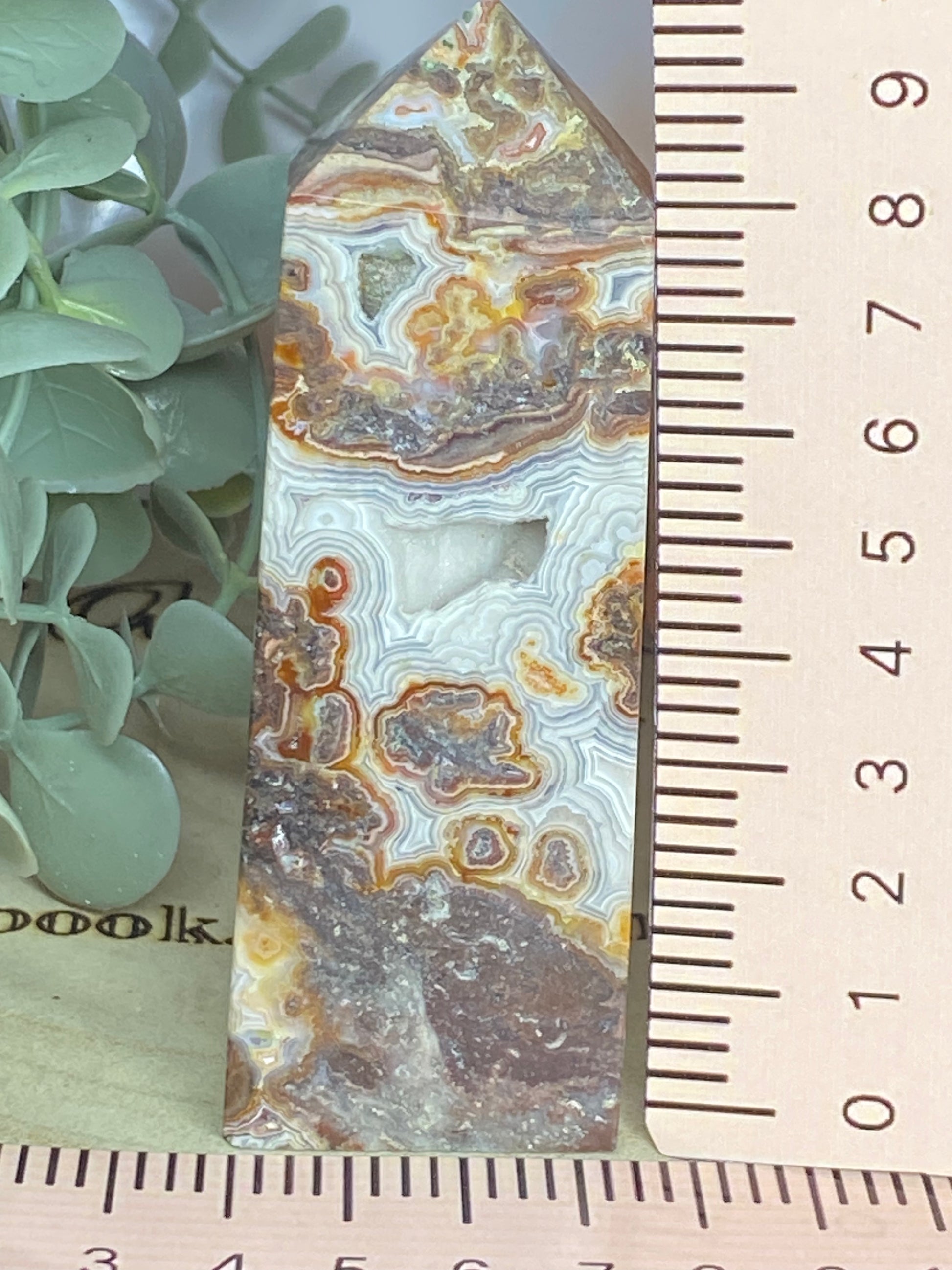 Discover the stunning natural beauty of the Mexican Crazy Agate Point. With amazing patterns and sparkling white druzies, this piece showcases Mother Nature's intricate artistry.