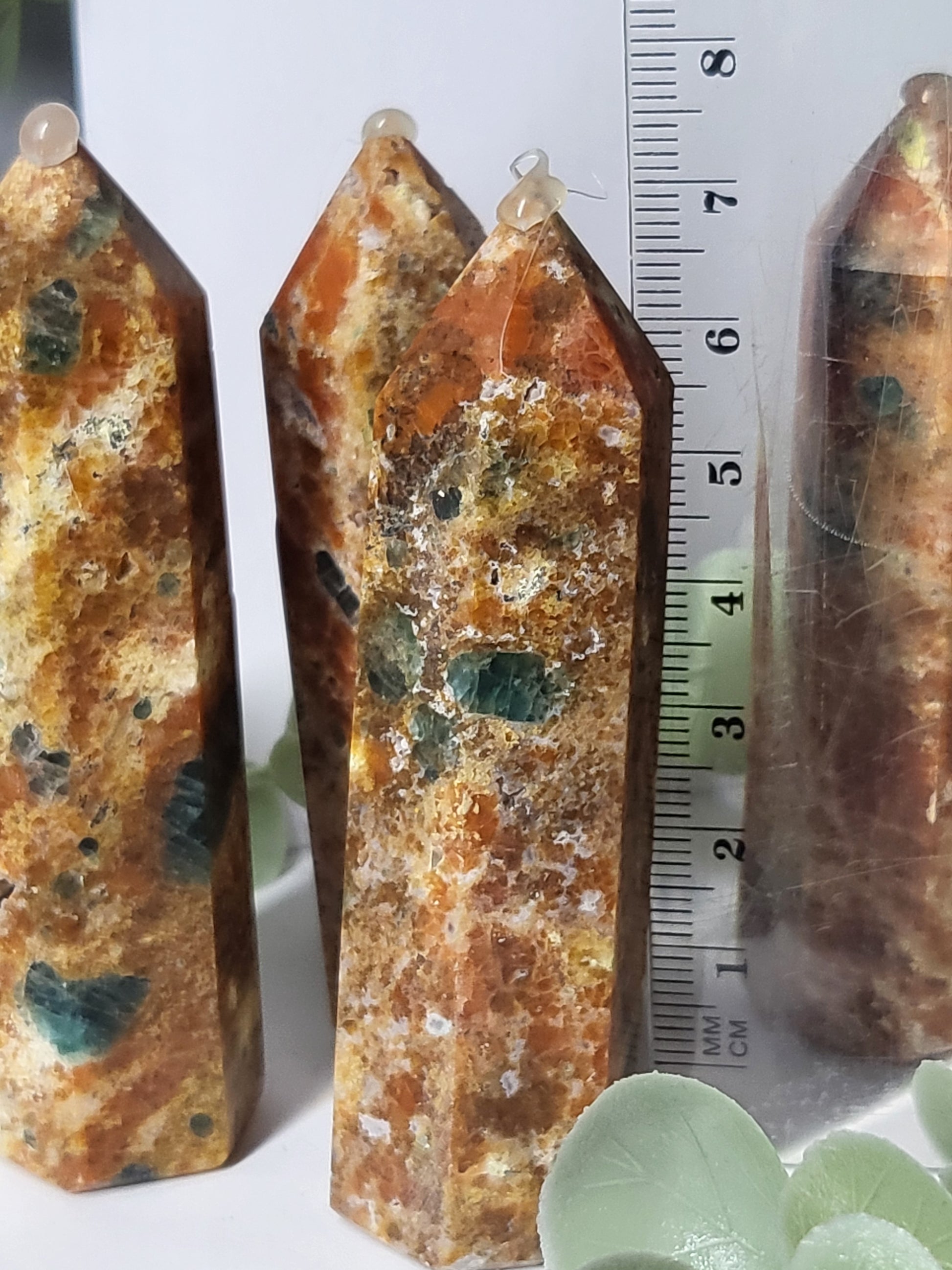 This stunning combination of orange calcite and blue apatite point makes a beautiful addition to any crystal collection. With the vibrant energy of orange calcite and the calming aura of blue apatite, this point is perfect for promoting balance and harmony in one's life. Expertly crafted and visually striking, this piece is sure to enhance any space with its unique beauty.