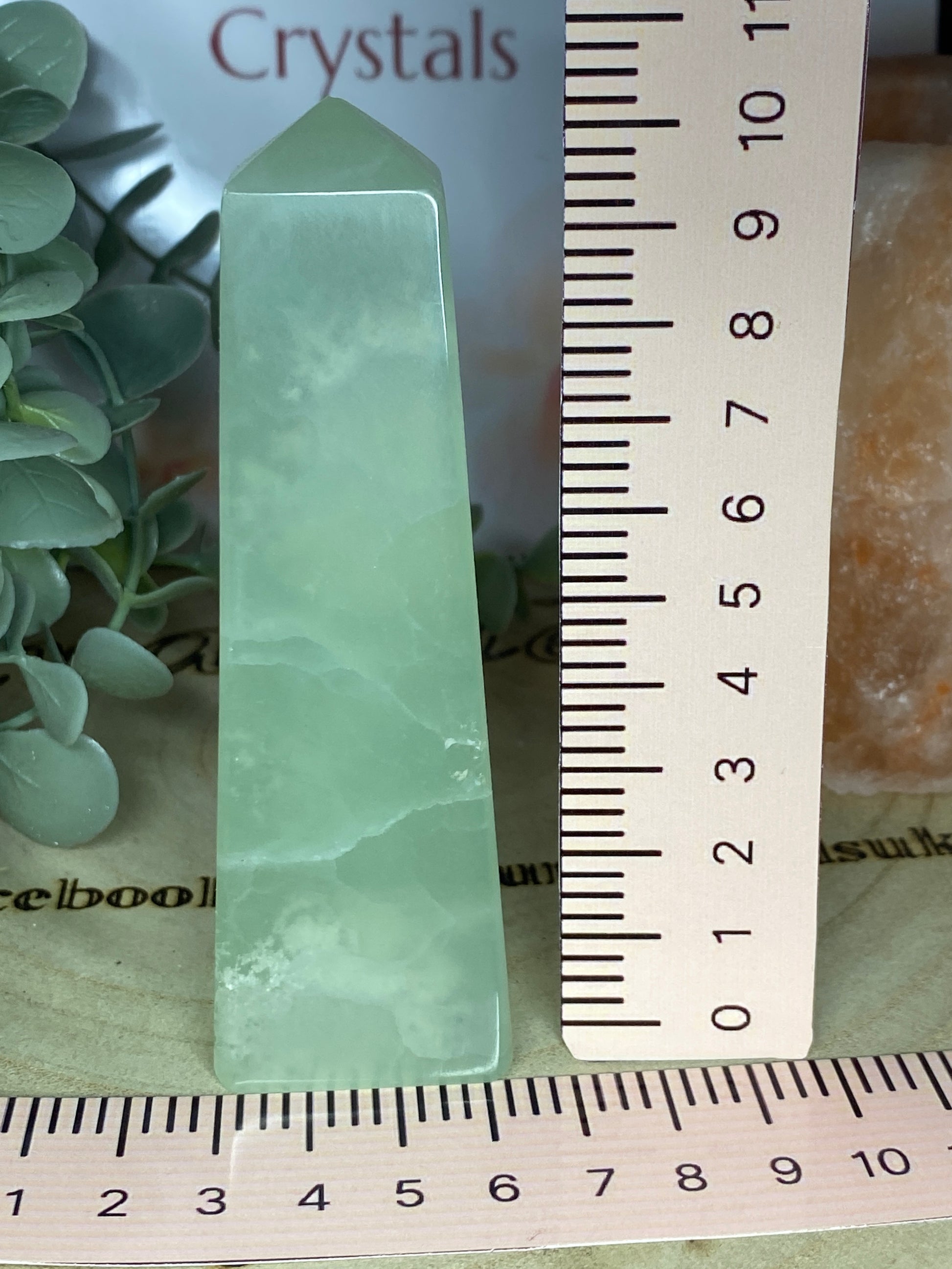 The gentle energy of pistachio calcite in a beautifully hand carved tower.