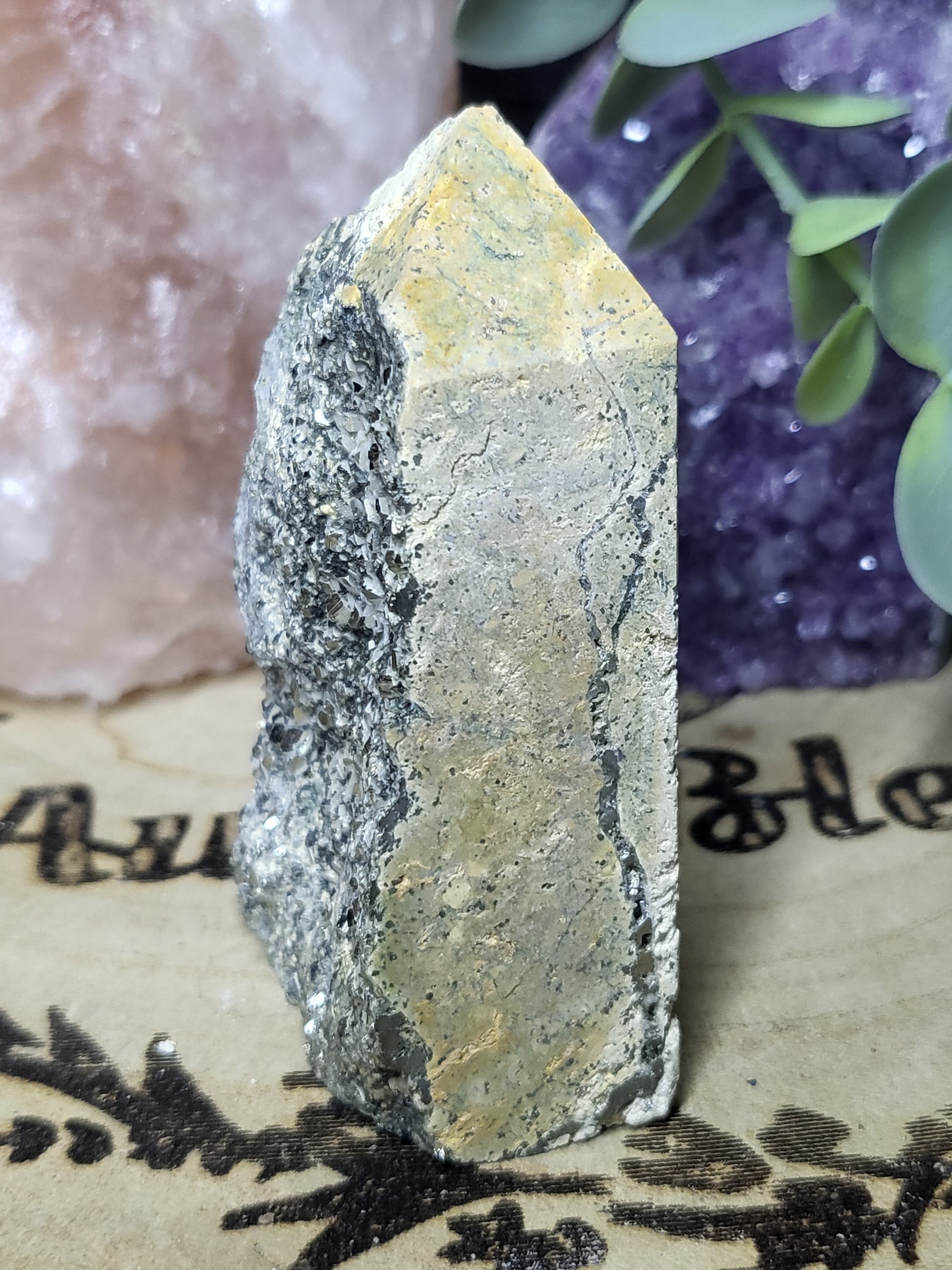This raw pyrite point is a unique stone featuring natural pyrite gold cube formations. Its shiny surface adds a touch of glamour to any collection. Known for its power to attract prosperity and luck, this raw stone is a must-have for those seeking positive energy.