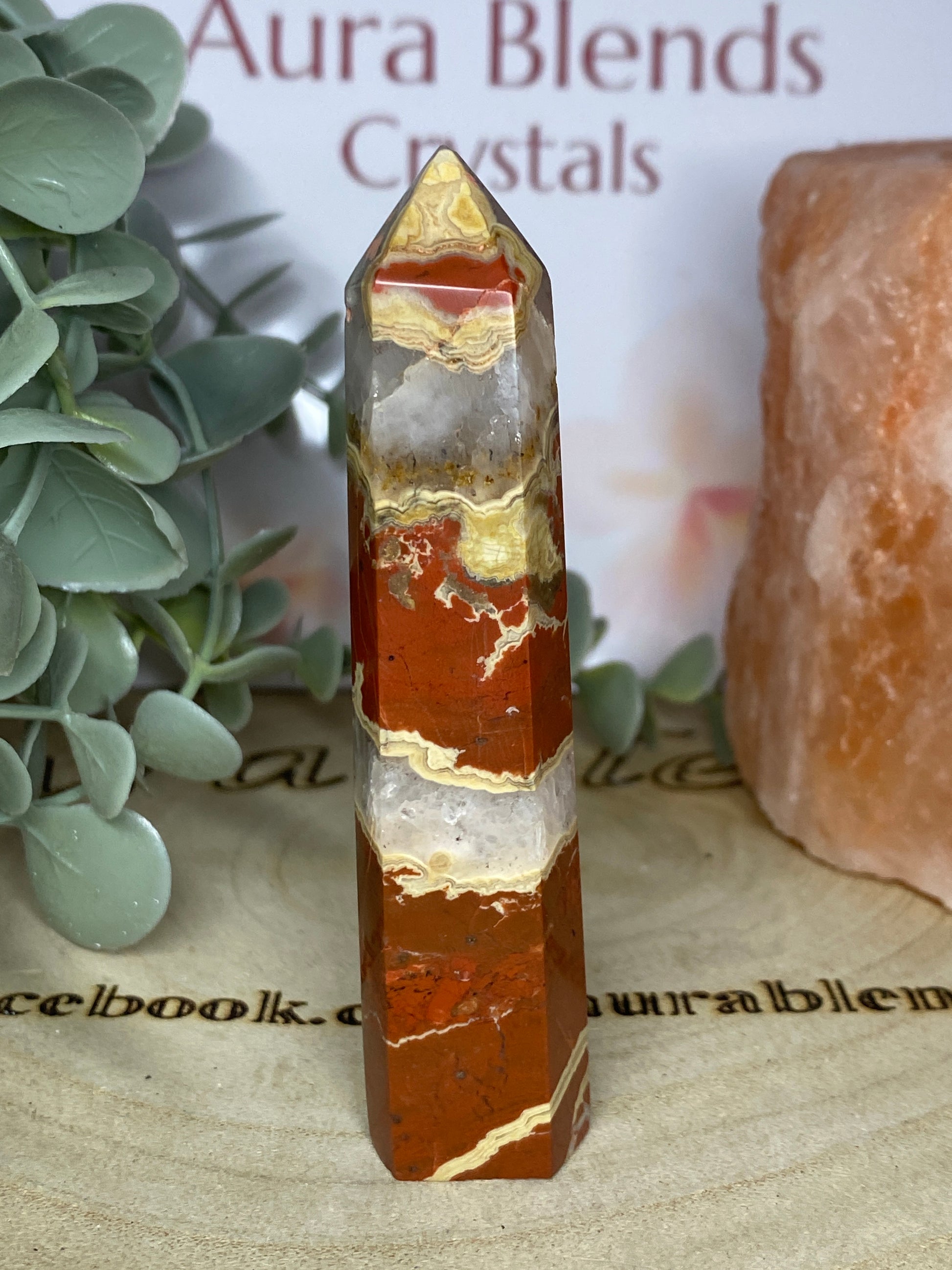 "Get grounded with our Red Jasper and Quartz Point! This unique combination also includes Crazy Lace Agate for an extra boost. Find balance and clarity with this captivating piece."