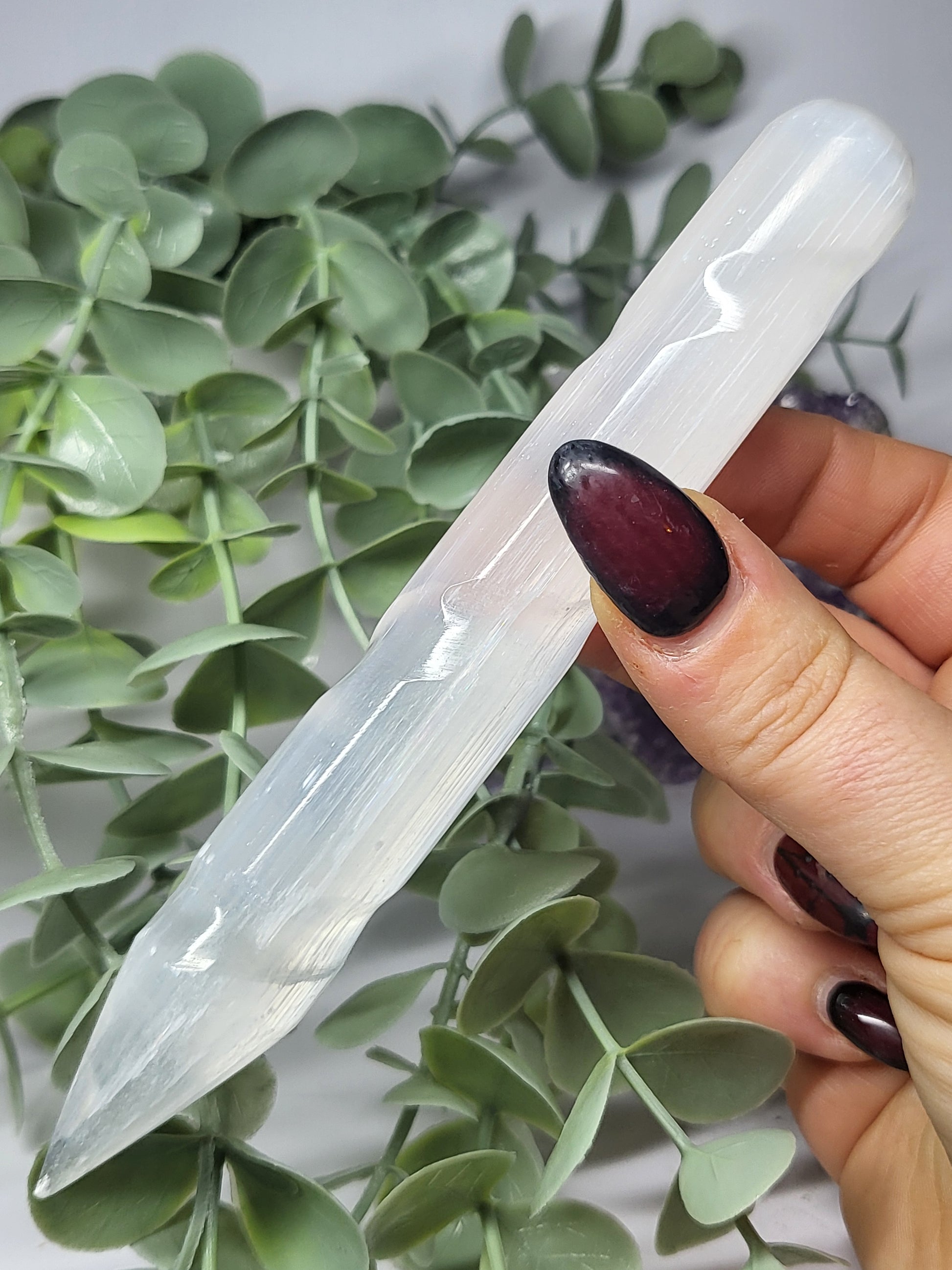 This Satin Spa (selenite) spiral wand is the perfect tool for cleansing and charging other crystals. Its unique properties make it an essential addition to any crystal collection. Experience the benefits of a pure and powerful energy with this expertly crafted wand.