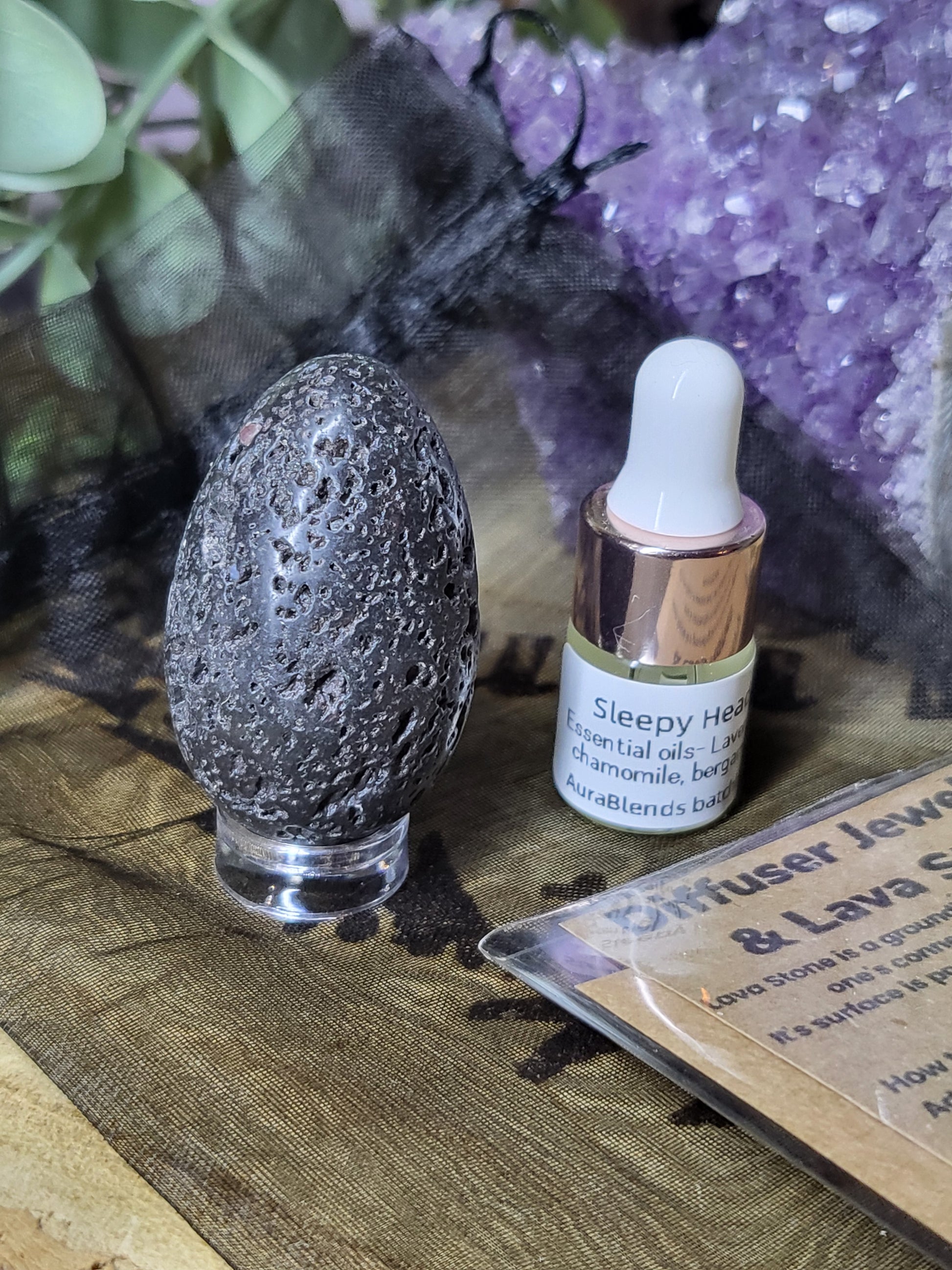 Introducing the Sleepy Head Gift Set - a perfect gift for anyone in need of a good night's sleep. It includes a lava stone egg and a stand, along with our specially formulated essential oil blend that promotes a restful sleep. Say goodbye to restless nights and hello to a rejuvenated morning with this thoughtful gift set.
