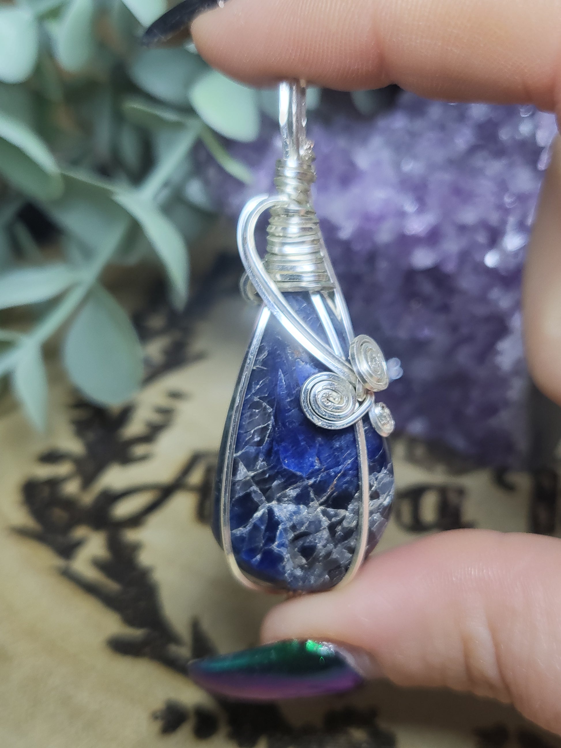 Made with genuine Sodalite stone, this wire wrapped pendant is crafted from silver plated copper wire that is known to amplify the natural energies of the crystal. The adjustable length black cord necklace adds a touch of versatility to this unique and powerful piece. Perfect for any crystal enthusiast.