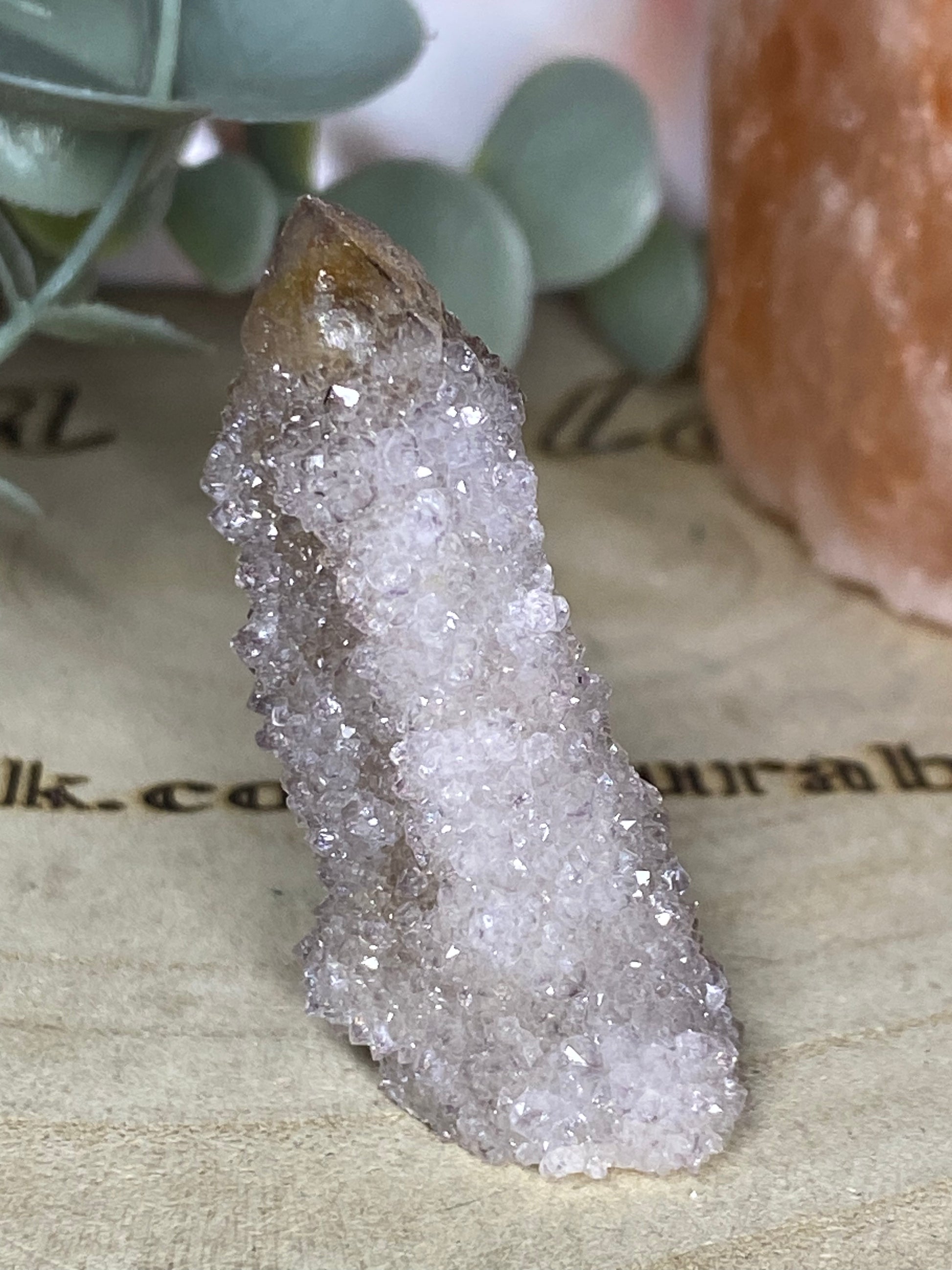Discover the fascinating and very rare combination of Smokey Amethyst Spirit Quartz with golden healer inclusions. This fine specimen will add a unique touch to your crystal collection with its beautiful golden healer point. A must-have for any crystal enthusiast.