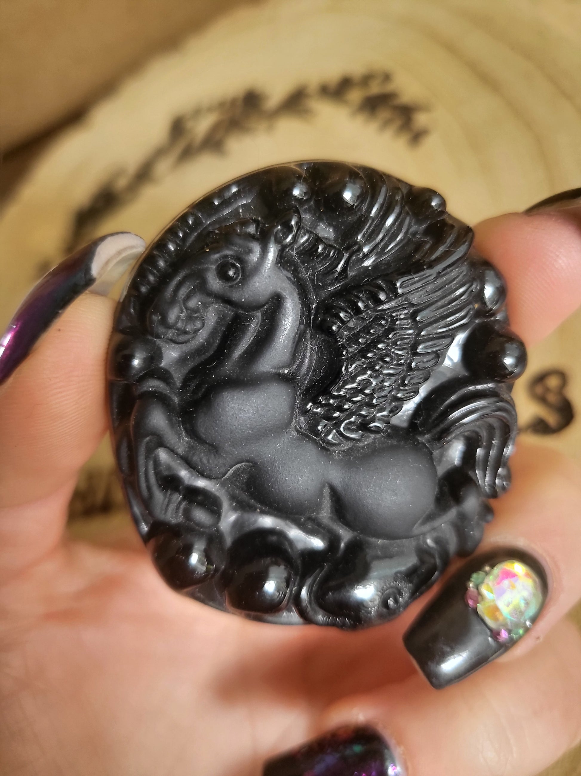 Beautifully carved obsidian pegasus, with small hole to give you the option to turn it in to a necklace, key chain or hanging.